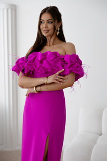 Długa sukienka z odkrytymi ramionami i efektownymi piórami-FUKSJA